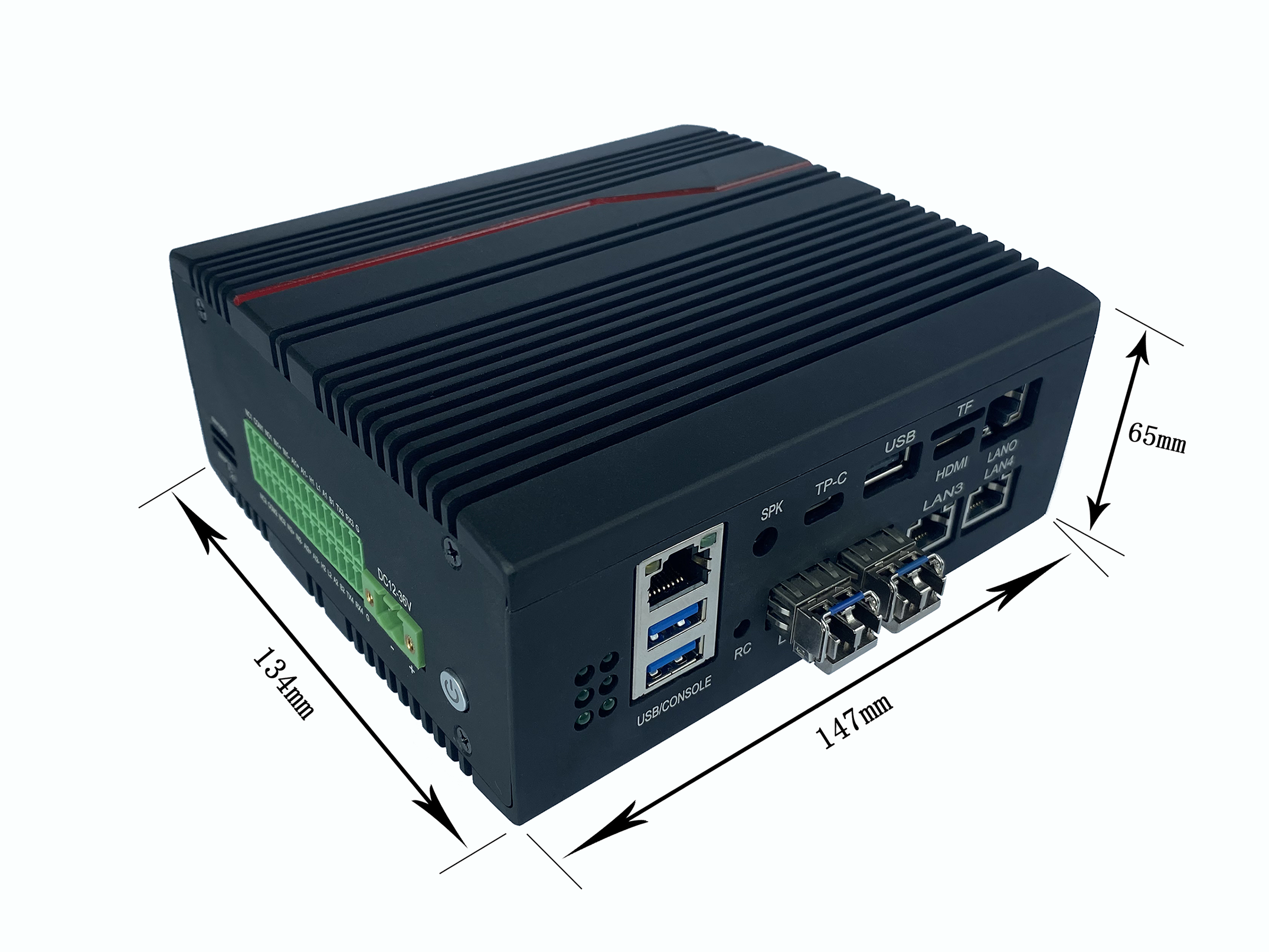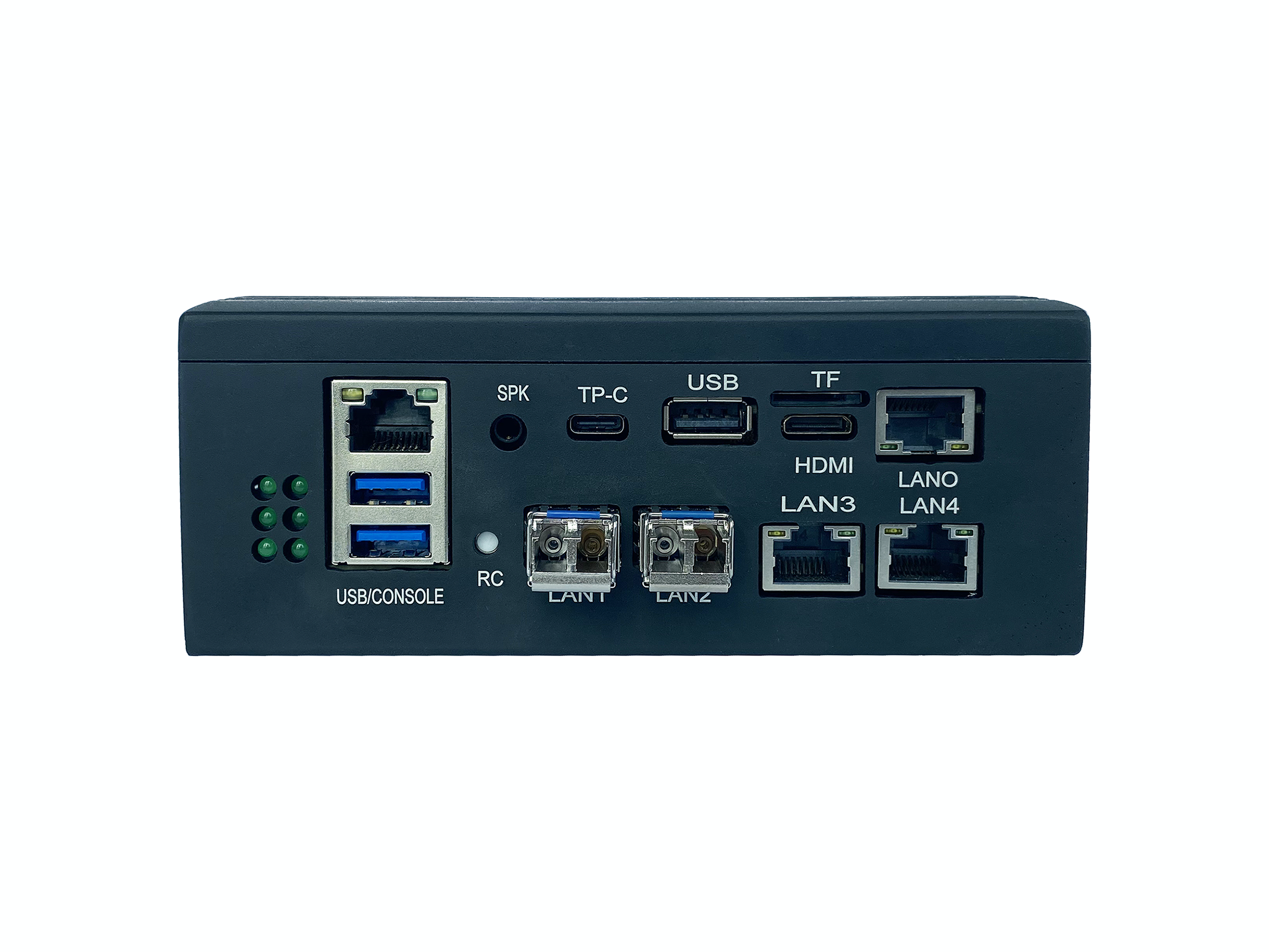 I/O接口 | 2*SFP,3*RJ45 Gig-LAN (接口防脱设计); 2*USB3.0 Type A ,1*TYPE-C,2xUSB2.0为内置杜邦插针接口; 4*COM (2*RS485和2*RS232带隔离,1*console口); 2* DI 9-36V、2* DO 默认 NC(常开)可选 NO(常闭)带隔离 ; 2*2.5KV光隔CAN (CAN Open2.0); 1*Audio-out (1x3.5 phone jack) ,1*HDMI 2*AI 4-20ma 电流 |